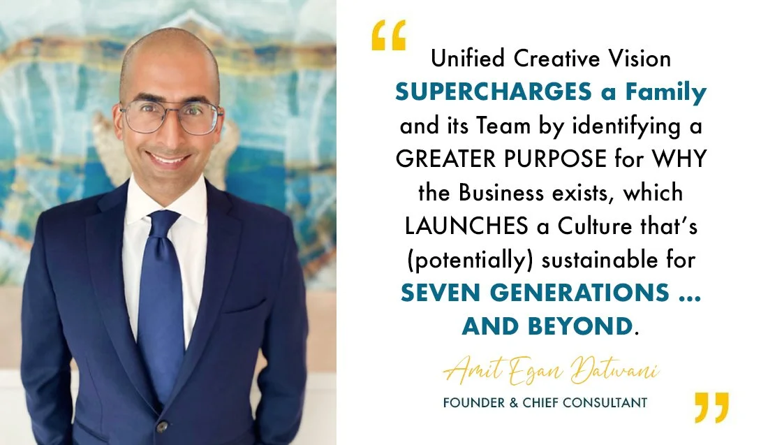 AED: It’s all about a “Unified Creative Vision” to SUPERCHARGE A FAMILY and its Team by providing them with a GREATER PURPOSE for why the Business exists. Do they have a meaning beyond generating Profit? Is there something that gets them out of bed every morning and drives them to Positively Impact Others and Enhance the Human Experience? Have they taken the time to deeply understand what they were born to do? Leading-Edge Families clearly identify the role and importance of their Family in their respective Communities. Unified Creative Vision pushes our Clients to think about these kinds of questions, so they can Create a Culture powerful enough, ideally, to sustain itself for “SEVEN GENERATIONS … AND BEYOND.”